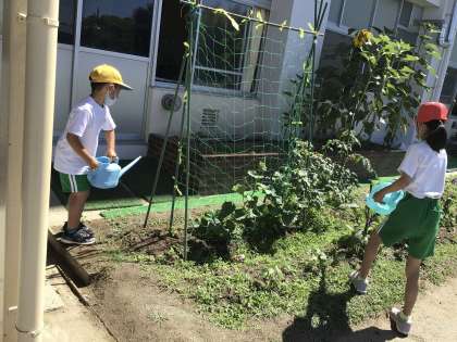 特別支援学級では、学級園でトマトやキュウリなどの野菜を育てています。