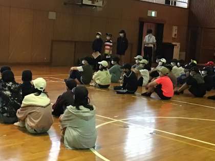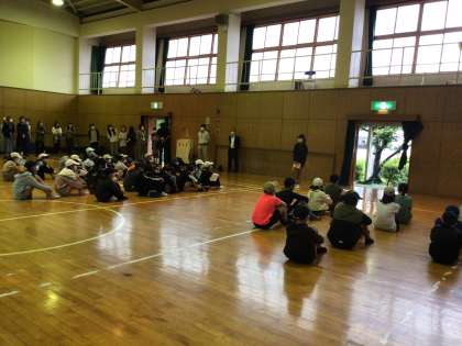 小雨の中、6年生が修学旅行に出かけました。体育館での出発式では、司会の児童の掛け声に合わせて、元気いっぱい「いってきます」のあいさつで出発しました。