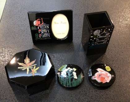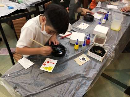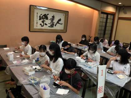 夕食と入浴後に、漆器に絵を描く絵付け体験をしました。絵付け用の特別な絵の具を使いました。薄く何度も塗り重ねることで美しい色合いになるそうです。