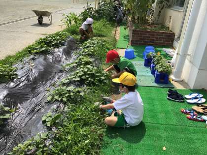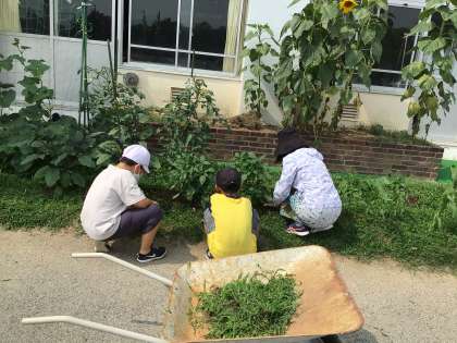 特別支援学級の畑の野菜が大きくなってきました。暑い中でも、草取りを頑張っています。