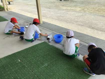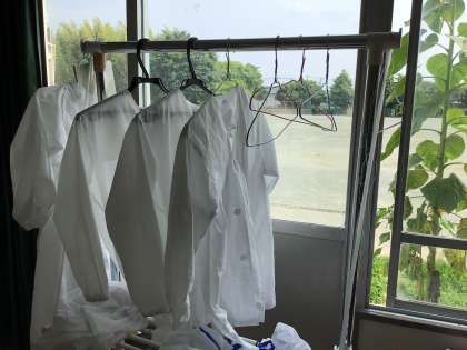 特別支援学級では、毎週金曜日には、給食のエプロンを洗濯機で洗って干しています。気候がいい時期は、シューズ洗いも頑張っています。ごしごし洗って汚れがとれると、気持ちがいいですね。