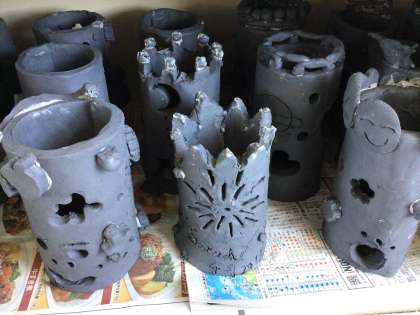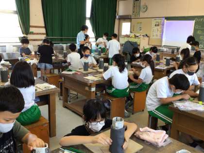 4年生陶芸教室 その2 公開日 2022/06/29 更新日 2022/06/29 各学年から 4年1組が「おかちゃん」先生を招いて陶芸教室でランプシェードを作りました。気温が高く天気が良いので早く粘土が乾いて固まってしまいそうでした。真剣な表情で形をくり抜いたり「どべ」をたっぷりと塗って粘土を付けたりと頑張って作品を仕上げました。片付けまでしっかりできたと、お褒めの言葉もいただきました。