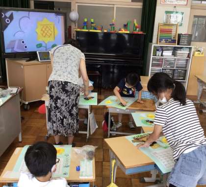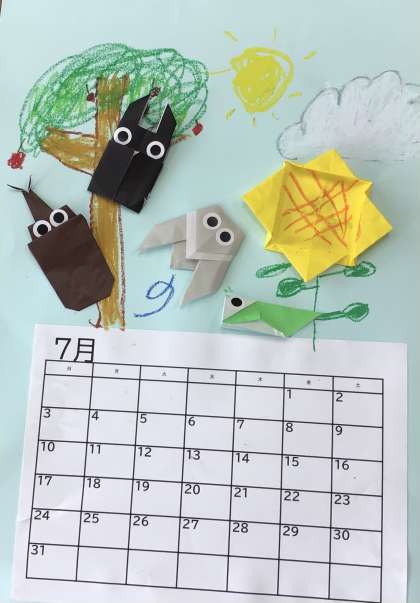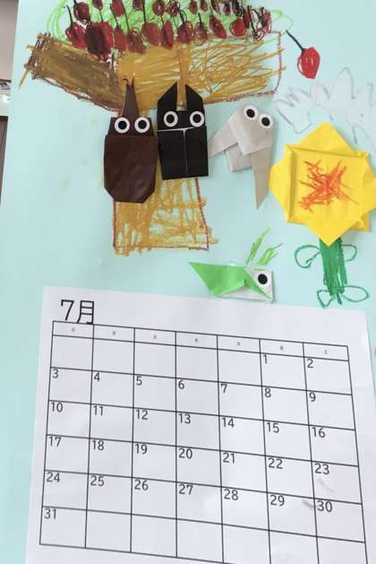 特別支援学級では、図画工作の学習で、毎月季節にちなんだ折り紙の作品を作って、それをカレンダーにしています。7月のテーマは、夏の昆虫です。丸い目玉がかわいいカブトムシやクワガタムシを頑張っておりました。