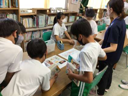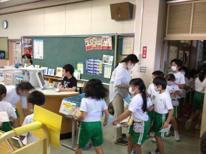 図書館まつりが開催されています。本をたくさん借りてスタンプがたくさんたまった人は、素敵なしおりを貰っています。貰ったしおりには、自分で記名します。月曜日は、図書館司書の先生が来る日です。今日もみんなが本を借りる様子を見守ってくれました。