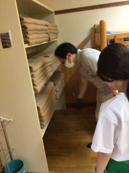 部屋の退出点検が行われました。所員の方に、布団や毛布のたたみ方から整頓まで、厳しく見てもらいましたが、全ての班が点検をクリアすることができました。