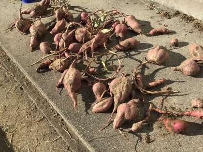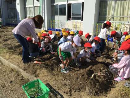 1.2年生が栽培しているサツマイモが、いよいよ食べごろになりました。学級ごとに日にちをかえて、芋掘りをしました。大きなサツマイモがたくさん収穫できました。