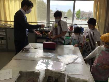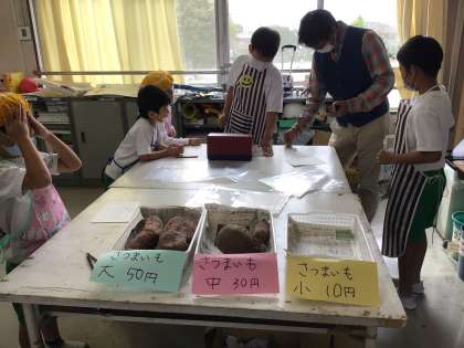 特別支援学級 スマイルスーパー開店します!その2 公開日 2022/10/25 更新日 2022/10/25 各学年から 本日も特別支援学級の子どもたちが職員室でスマイルスーパーを開店しました。職員室に可愛らしい「いらっしゃいませ」「ありがとうございました」の声が響きました。笑顔で品物のサツマイモを渡したり、正しくお釣りの計算をしたり、子どもたちは頑張りました。