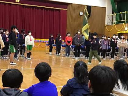 小学校生活を振り返るスライドショー、校旗の引き継ぎ、5年生から6年生への贈る言葉、6年生から5年生へのお礼や励ましの言葉と続き、和やかな雰囲気から厳かな雰囲気にかわって行きました。