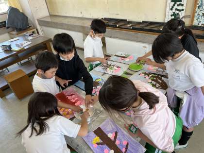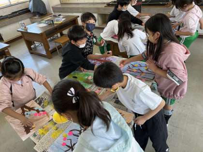 ペットボトルキャップを使って華やかな桜の木を描いていました。