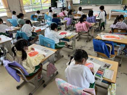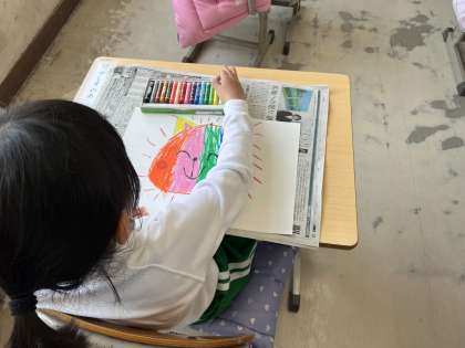 1年3組の図工の授業です。 自分だけのにっこにこお日様を描いていました。