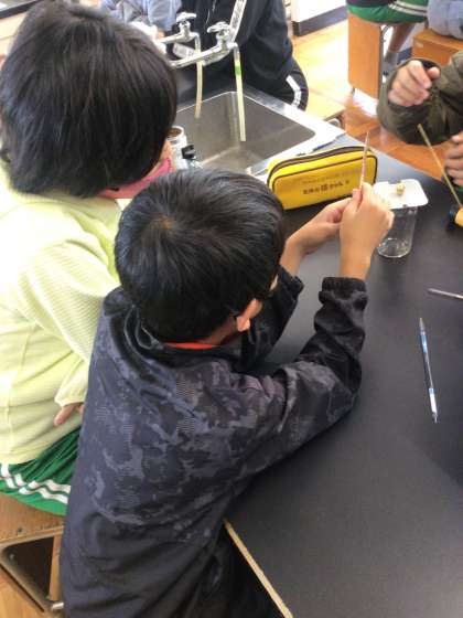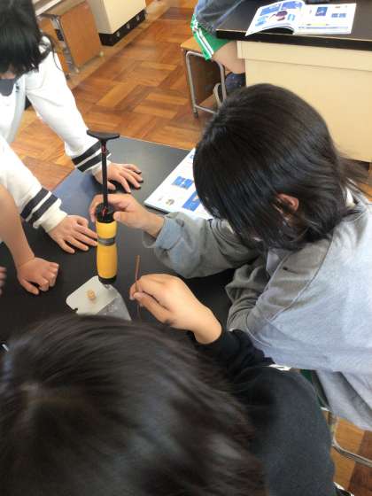 ものが燃えるときの空気の変化を学んでいます。燃える前後の酸素、二酸化炭素の体積の割合を調べました。気体検知管の使い方をしっかりと学び、真剣に取り組むことができました。次は、結果から考察をしていきます。