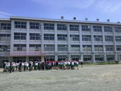 気持ちのよい青空のもと、5、6年生が集団行動の練習をしていました。気をつけの姿勢を意識して話を聴く姿に感心しました!