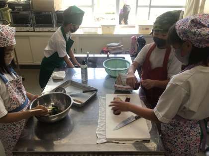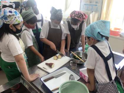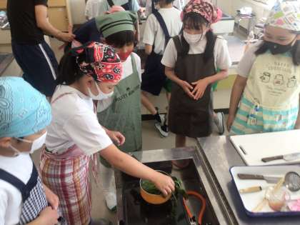 5年生が調理実習でほうれん草のおひたしとゆでさつまいもを作りました。おいしくできました!