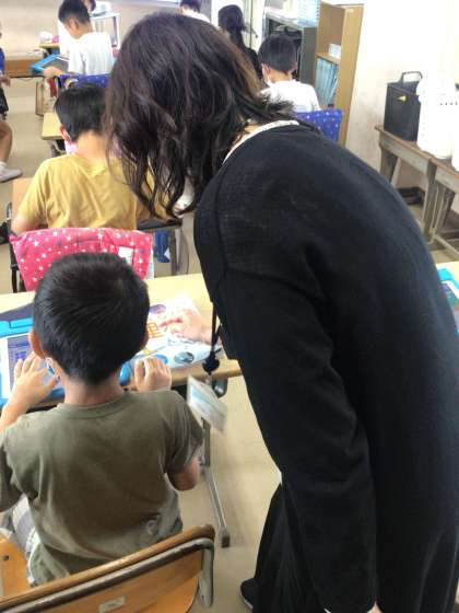 スクラッチを活用してプログラミング教育を行いました。ICT支援員の方が、子どもたちの質問に丁寧にこたえ、アドバイスを送っていました。魚を動かすプログラムを楽しく学ぶ子どもたちの姿が、たくさん見られました!