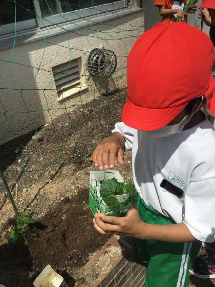 4年生は理科の授業でツルレイシの栽培をしています。今までは教室で栽培、観察をしていましたが、今週からは花壇で育てていきます。緑のカーテンができるように大切に育てていきます。