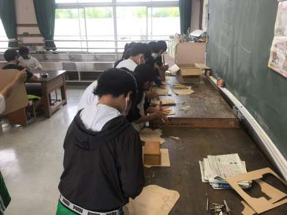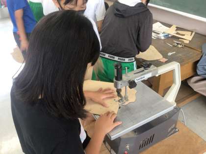 5年生の図工の授業です。オリジナルのホワイトボードを作っています。電動糸ノコギリやキリを使っています。