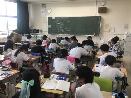 5年2組は美しく書くことを意識しながら、真剣に漢字を練習しています。