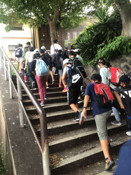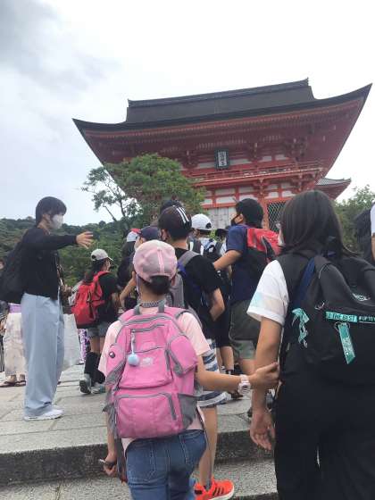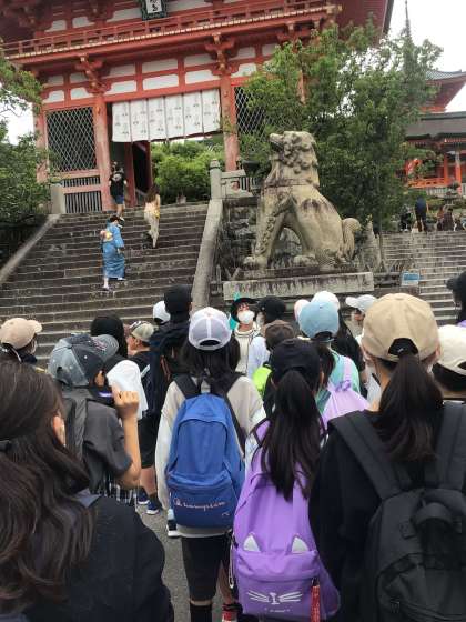 清水寺に到着しました。クラス写真をとり、各クラスごとにガイドさんの話を聞き、学んでいます。
