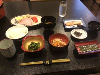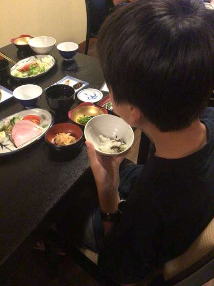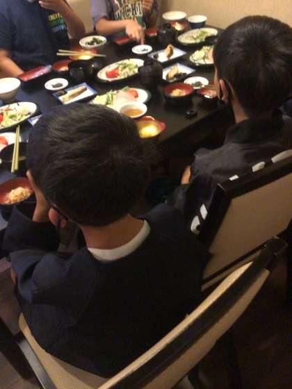 朝食の様子です。朝から明るい雰囲気で食事をしています。この後、東大寺に向かいます。