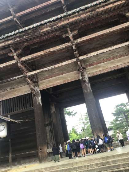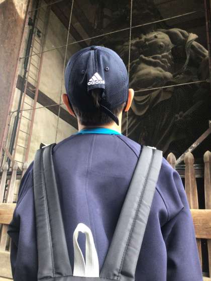 南大門、金剛力士像を見学しています。大きさに驚き、ガイドさんの話に真剣に耳を傾けています。