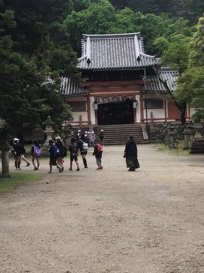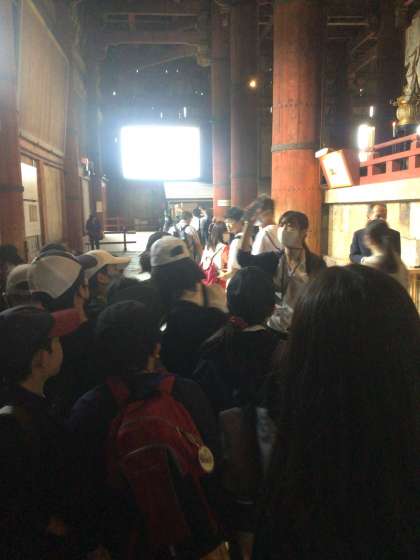 東大寺から若草山にかけて「マチ探」を行なっています。貸し出したスマホ端末を使って、問題を解いていきます。説明をしっかりと聞き、班別で奈良の町に繰り出しています。