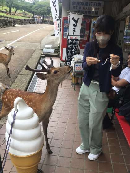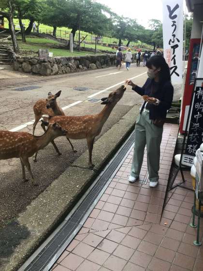 鹿せんべいを購入し、鹿と遊んでいます。鹿の勢いに驚きつつも楽しんでます!