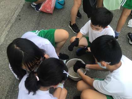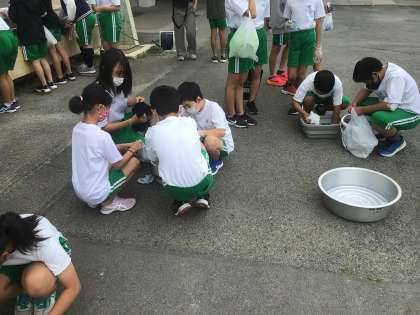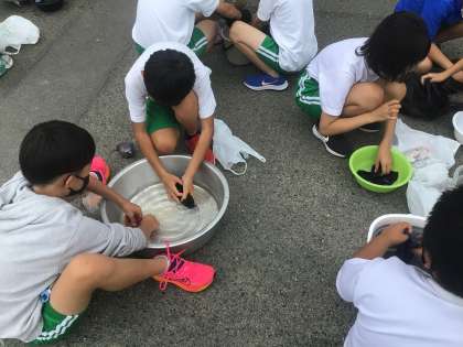 自分が履いている靴下を手洗いしました。みんな、洗いがいがあるように、わざと醤油かソースをつけてから洗いました。丁寧に洗って、とてもきれいになりました。