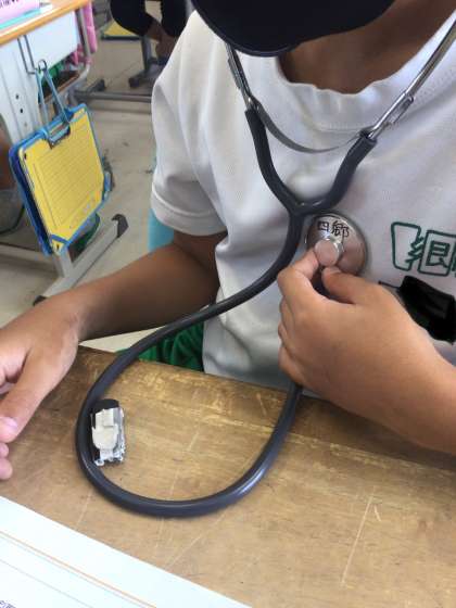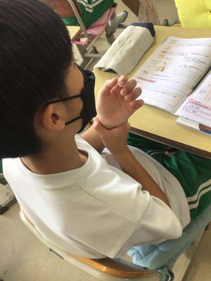 血液の循環について学びました。心臓の音を聞き、体の中のことを音で感じました。また、拍動数と脈拍数を数え、体中をめぐる血液について学びを深めました。