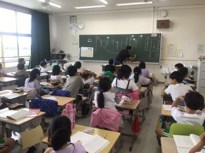 5年生は国語の授業で『世界でいちばんやかましい音』という物語を読んでいます。2組は物語の設定についてグループで確認しています。1組はどうしてお祝いが沈黙になってしまったのか、みんなで考えて意見を出し合っています。