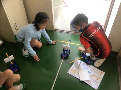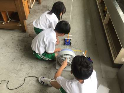 先週作り始めたゴム車が完成し、どれぐらい走行できるか、距離を測っています。扇風機で風を送るとどのぐらい進む距離が変わるかも比べています。