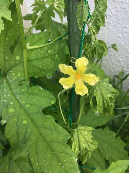 4年生の理科で観察しているツルレイシです。花壇で育て始め、約3週間経って大きく成長しています。今日は花が咲いていました。この後、どのように成長していくのかをしっかり観察していきます。