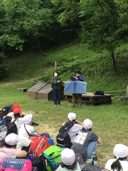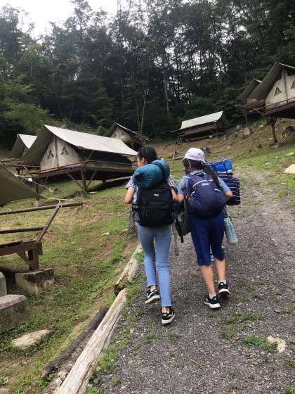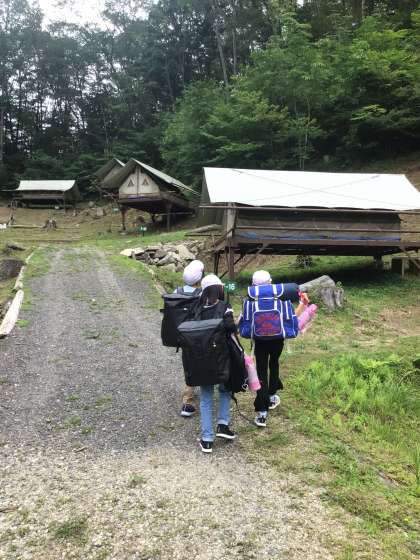 オリエンテーションを行い、テントに入っています。子どもたちはとても楽しそうにしています。順調にすすんでいます。