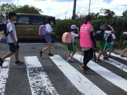 夏休み明け初日から猛暑。見守り隊の方々に付き添っていただき、安心です。転入生も多く、月曜日の朝、しっかり並んできてほしいです。