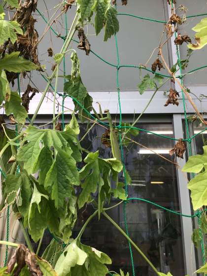 ツルレイシの実やオレンジ色になった実などを興奮気味に教えてくれました。また、カマキリを発見していました。この写真にカマキリがいます。見つけられましたか?