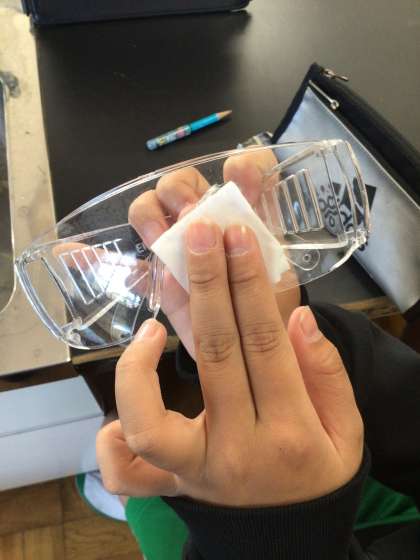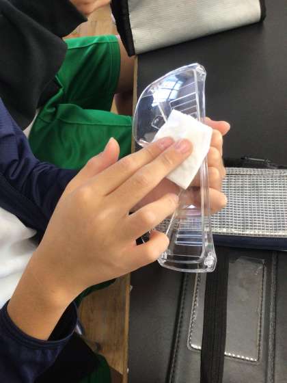 5年2組の理科では、前回行った実験についてPMIシートを活用して振り返りをしました。次の実験をするときには、さらに実験技能が向上していると思います。また、普段実験で使用している保護メガネを消毒しました。これからも安全に気をつけて実験、観察をすすめていきます。