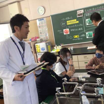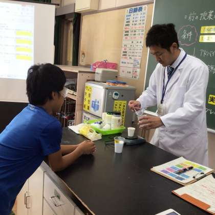 公開授業5年2組の様子です。理科の授業で、ものが水にとける限界をこえるにはどうしたらよいか考えて実験に取り組んでいました。