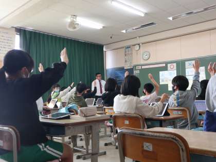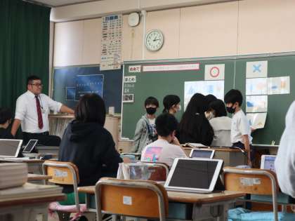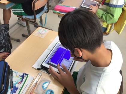公開授業6年1組の様子です。算数の授業で、拡大図と縮図の関係になっている図形を見つけて、学習用タブレットを使って説明していました。