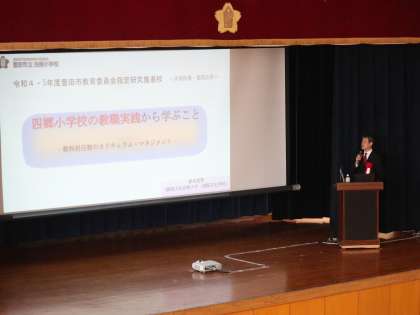 10/27研究発表会8 公開日 2023/10/30 更新日 2023/10/30 学校行事 教科説明会の後に行われた講演会と閉会行事の様子です。静岡文化芸術大学の倉本教授がご講演くださいました。教科担任制の重要性が改めて分かりました。 四郷小学校保護者の皆様、本校の研究発表会が盛会のうちに終えられましたのは、保護者の皆様のご理解・ご協力があったからです。本当にありがとうございました。今後ともよろしくお願いいたします。