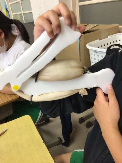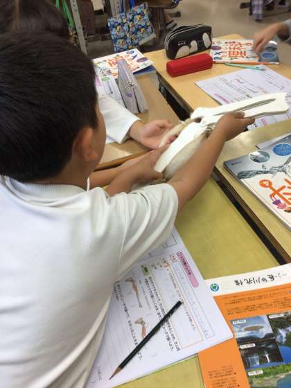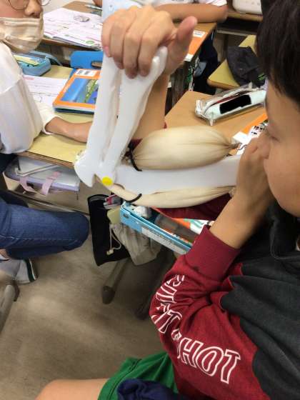 4年生理科の授業の様子です。筋肉の動きについて学びました。模型と自分の筋肉を比べながら、関連づけて考えることができました。