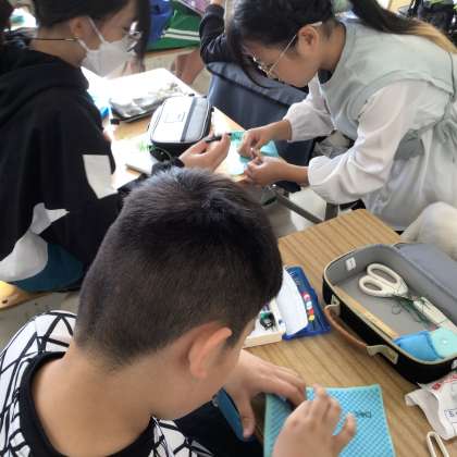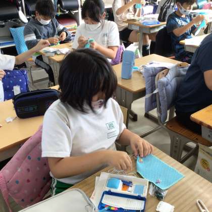 5年生が、家庭科で、フェルトを使ってティッシュケースを製作していました。玉どめや玉結びに悪戦苦闘。かがり縫いにも挑戦していました。仕上がりが楽しみです。