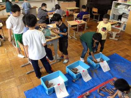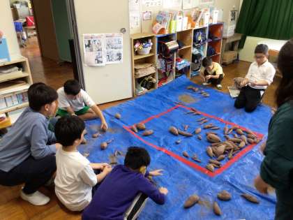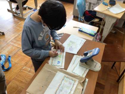 サツマイモの販売をするために、みんなで協力して準備を進めています。イモの大きさによって値段を決めたり、いらない紙を再利用してお客さんに渡す袋を作ったり、はりきって活動しました。