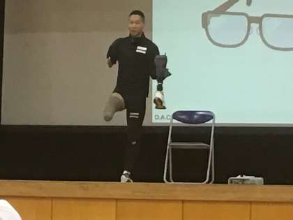 3年生が、総合的な学習の時間に、陸上競技(100m)パラリンピック日本代表候補の池田樹生選手をお迎えして、講演会を開きました。講演会では、自分の体が友達と違うと気づいた時の気持ちや、体の違いも自分だと受け止めていろいろなことにチャレンジしながら、陸上競技にたどり着いたことをお話ししてくれました。 「義足や義手はメガネと同じで、自分のやりたいことを補ってくれる道具」という言葉に、子どもたちから「なるほど」という声が漏れました。