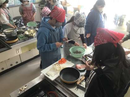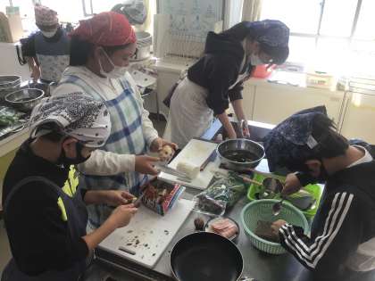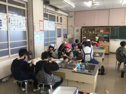 6年1組が調理実習を行いました。昨年度実施できなかったお鍋でごはんを炊く体験をしました。他にもウインナーソーセージ入りスクランブルエッグとベーコンとほうれんそうのソテー、けんちん汁も作りました。栄養バランスのよい1食メニューを、グループの仲間と協力して作り上げることができました。おいしくできたので、みんな完食しました!