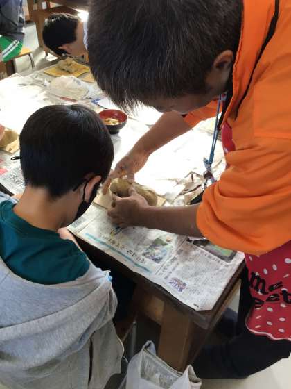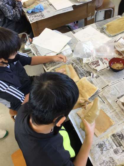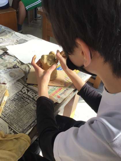 講師の方と焼き粘土を作る授業の様子です。下絵を描き、それを形にしていきます。みんな集中して作品を作っていました!