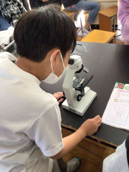 5年1組の授業の様子です。花粉を顕微鏡で観察しました。花粉には、さまざまな形があることに気づく人もいました。なぜ、形がちがうのか、学習をすすめていきます。