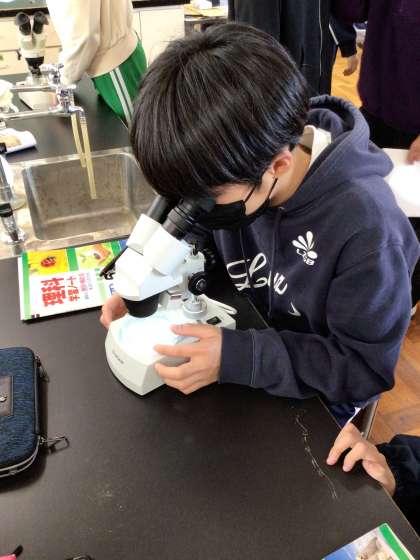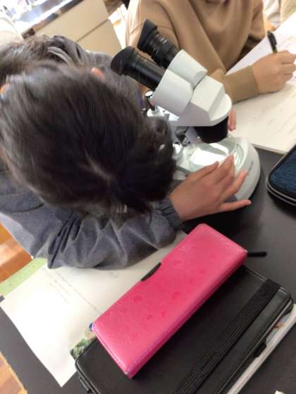 6年1組の様子です。今日は桜島の火山灰を観察しました。火山灰には、キラキラしたものがあることや角ばっているものが多いことに気づくことができました。
