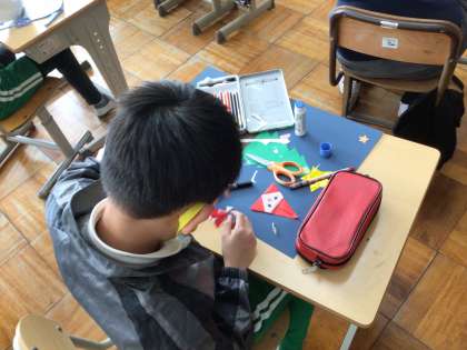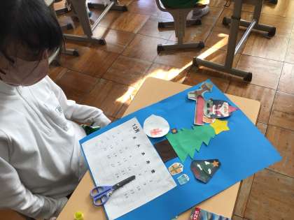 5時間目、7、8、9組ではサンタクロースやもみの木、プレゼントの箱を思い思いに貼っていました。どこに飾ろうかな。
