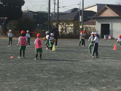 1年生の子たちがグランパスの選手たちにサッカーを教わっています。みんなとっても楽しそうです。