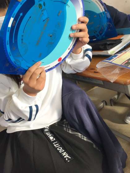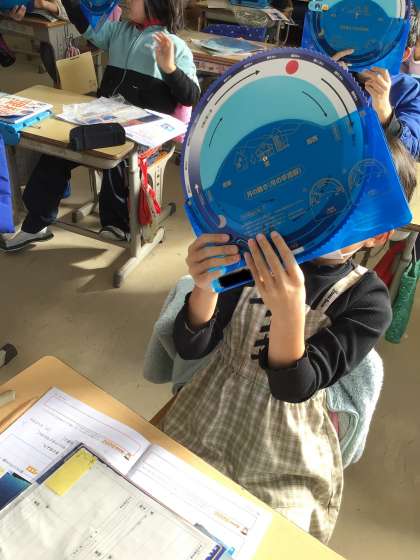 4年1組の授業の様子です。冬の星について学びました。星座早見を活用して、今日、夜空に見られる星を自分たちで見つけました。また、学習用タブレットに入っているアプリを活用して、星のならび方や位置について主体的に学びました。
