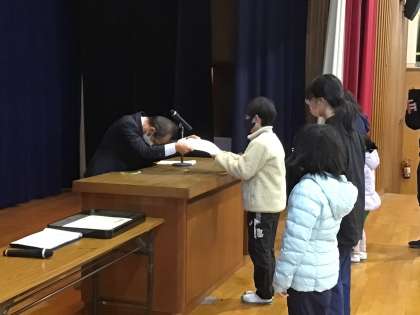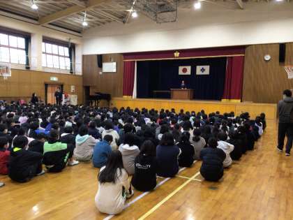 今年度初めての全校集会でした。今年一の寒さでしたが、校長先生や生徒指導の話や夏休み中作品応募の表彰をし、最後には校歌を全校合唱しました。